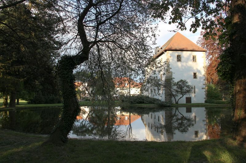 Seitlicher Blick auf das historische Alte Schloss umgeben von Bäumen | © Stadt Neckarbischofsheim