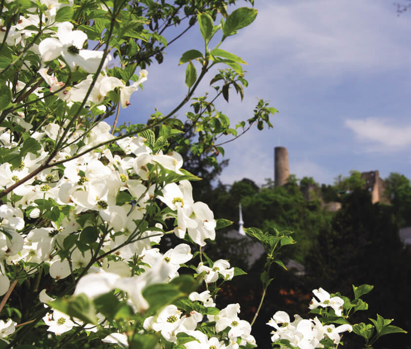 Im Vordergrund ist ein weißblühender Busch, im Hintergrund ist auf dem bewaldeten Hügel die Burg vor strahlend blauem Himmel zu sehen. | © Maria Zimmermann