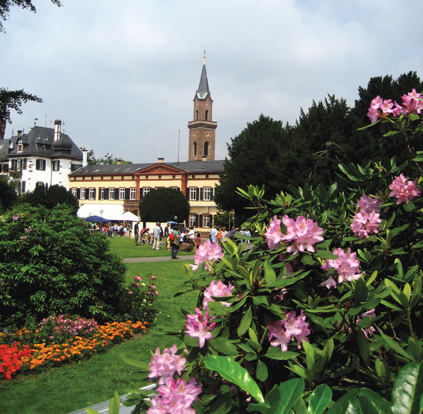 Blühende Rhododenrenbüsche im Schlosspak vor dem Weinheimer Schloss. | © Maria Zimmermann