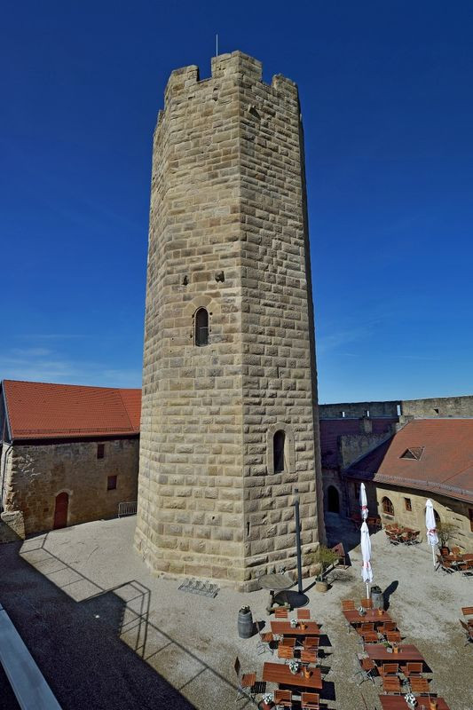 Blick auf den Bergfried der Burg Steinsberg unter blauem Himmel | © Stadtverwaltung Sinsheim