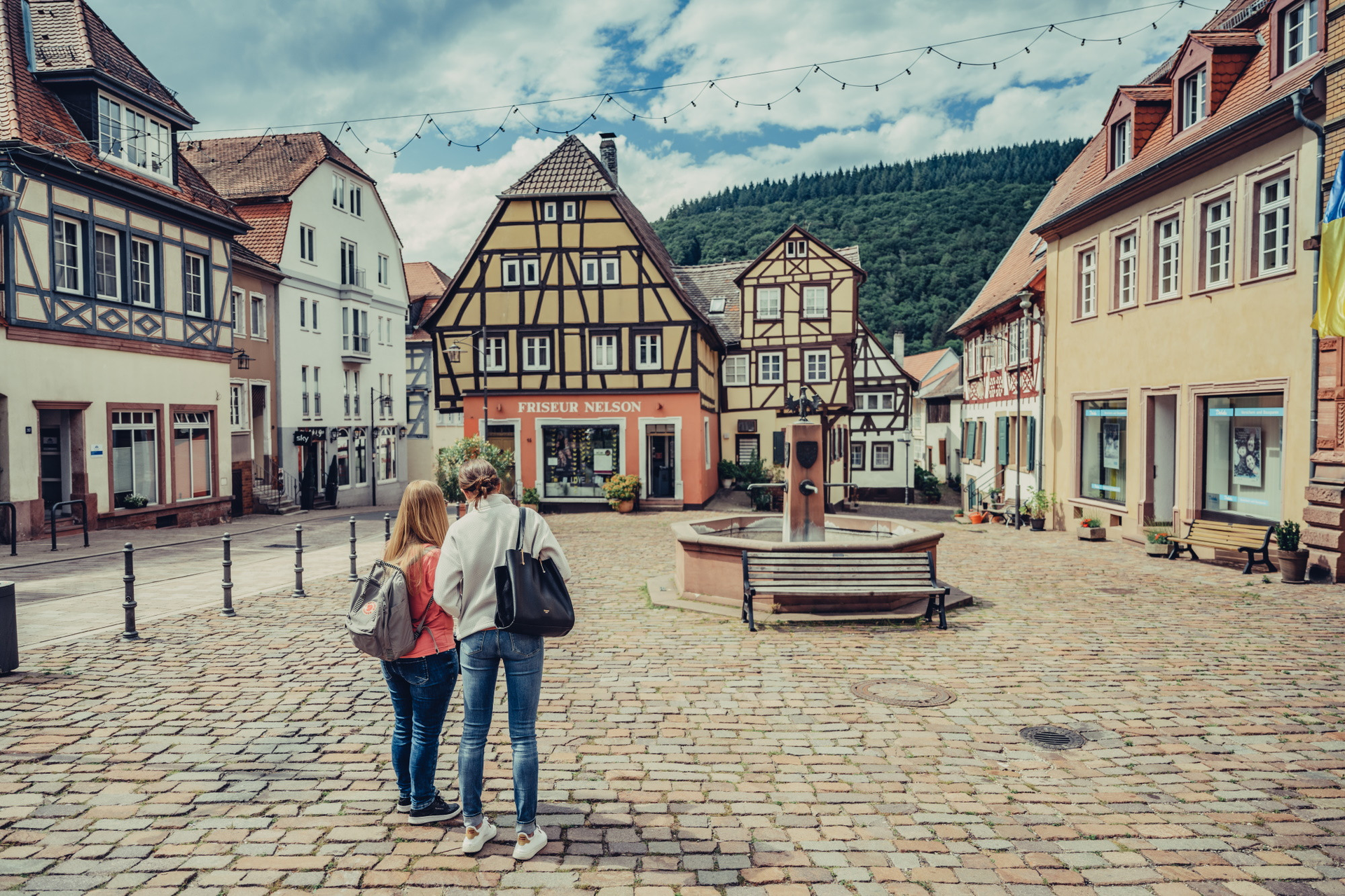 Ein Platz in einer Altstadt mit Kopsteinpflaster. In der Mitte ist ein Brunnen davor stehen zwei Frauen. Um den Platz stehen Fachwerkhäuser. Neckargemünd im Odenwald. | © Touristikgemeinschaft Odenwald e.V.