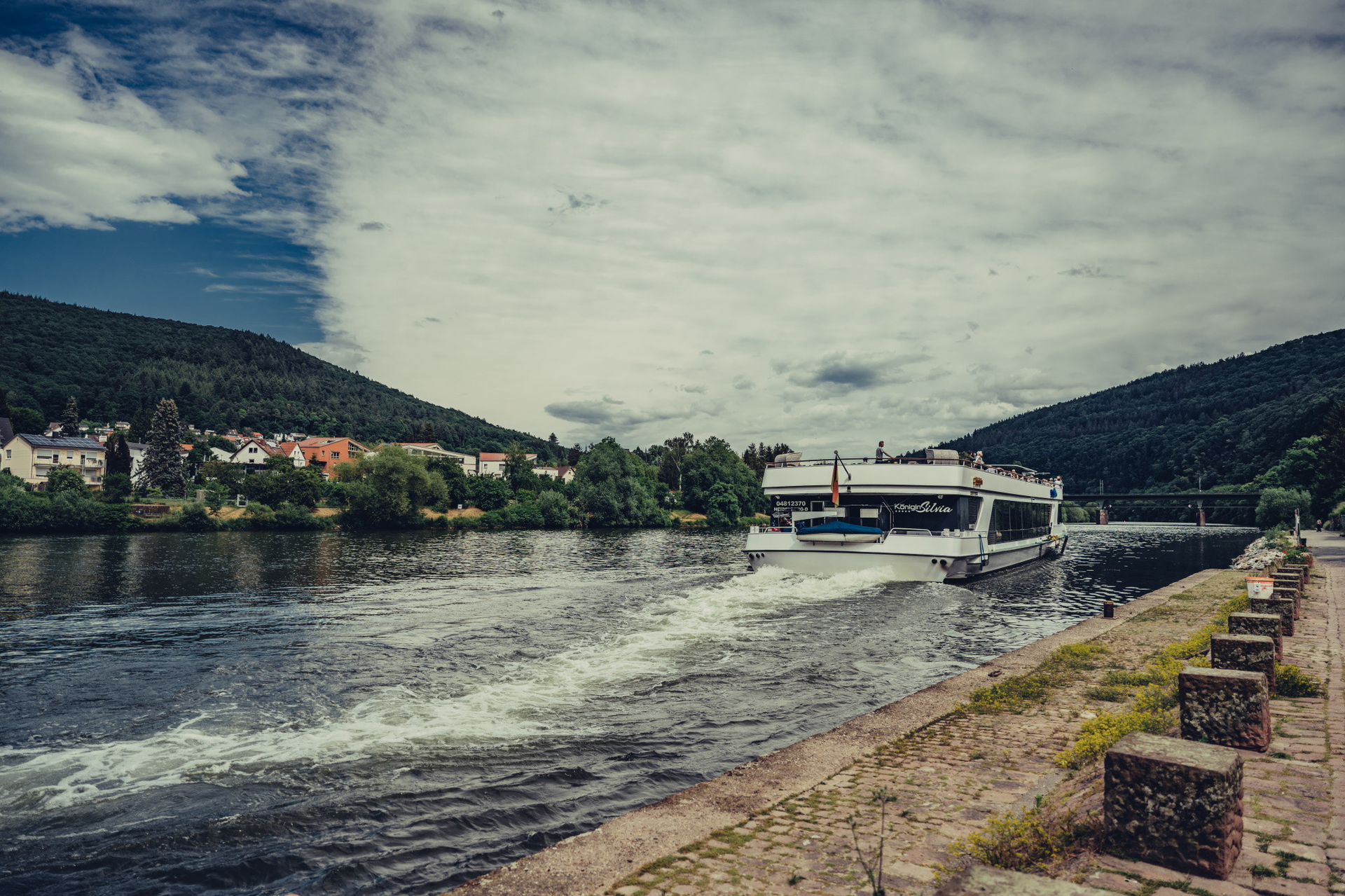 Ein weißess Ausflugsschiff welches auf einem Fluss fährt. Auf der linken Seite am Ufer sieht man eine Stadt. Neckargemünd im Odenwald. | © Touristikgemeinschaft Odenwald e.V.