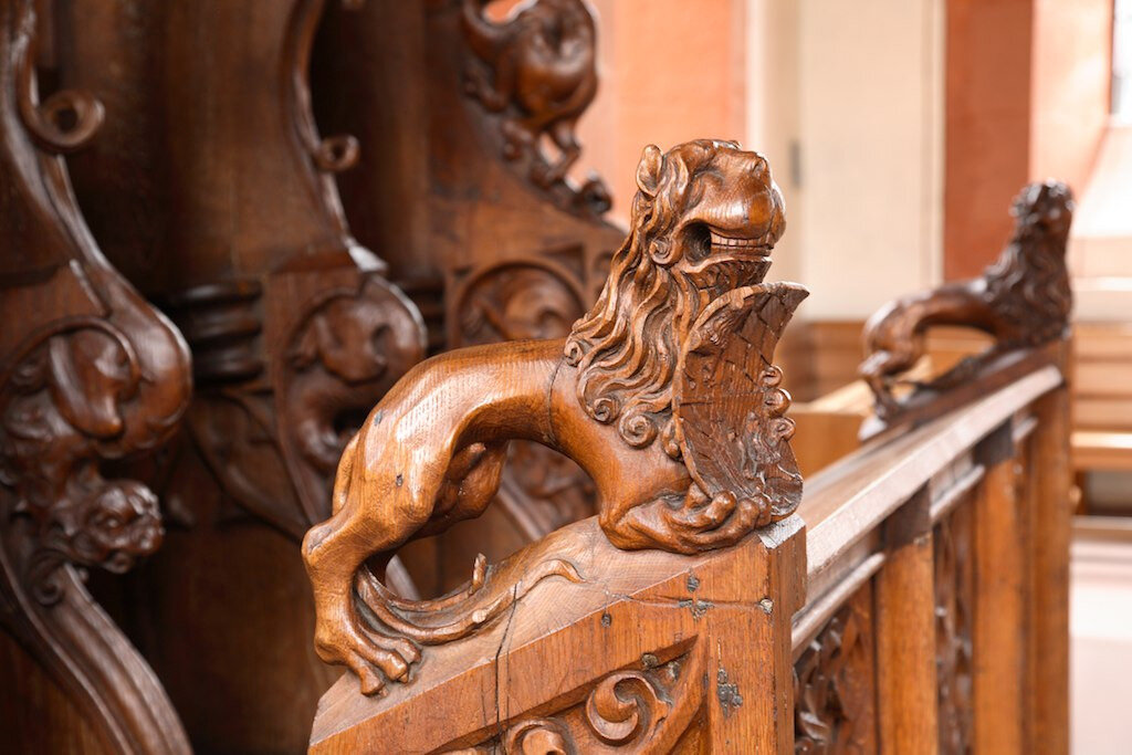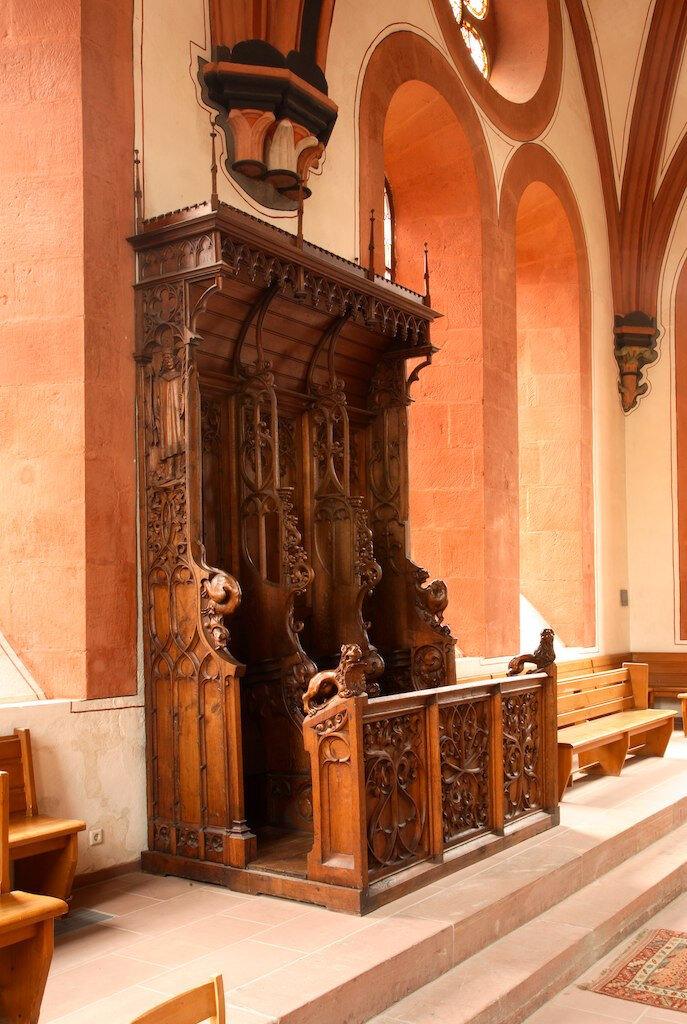 Aus dem Chor der ehemaligen Klosterkirche stammt der hölzerne Dreisitz, der heute an der Südwand der Kirche steht. Während des Gottesdienstes nahmen hier die Herrenmönche Platz. Der Dreisitz ist aufwendig gearbeitet und zeigt reiche Dekoration mit Maßwerk und Pflanzenformen. Ein Löwe an der Ecke der Kniebank hält in seinen Pranken das Wappen der Pfalzgrafen, der Schutzherren des Klosters.