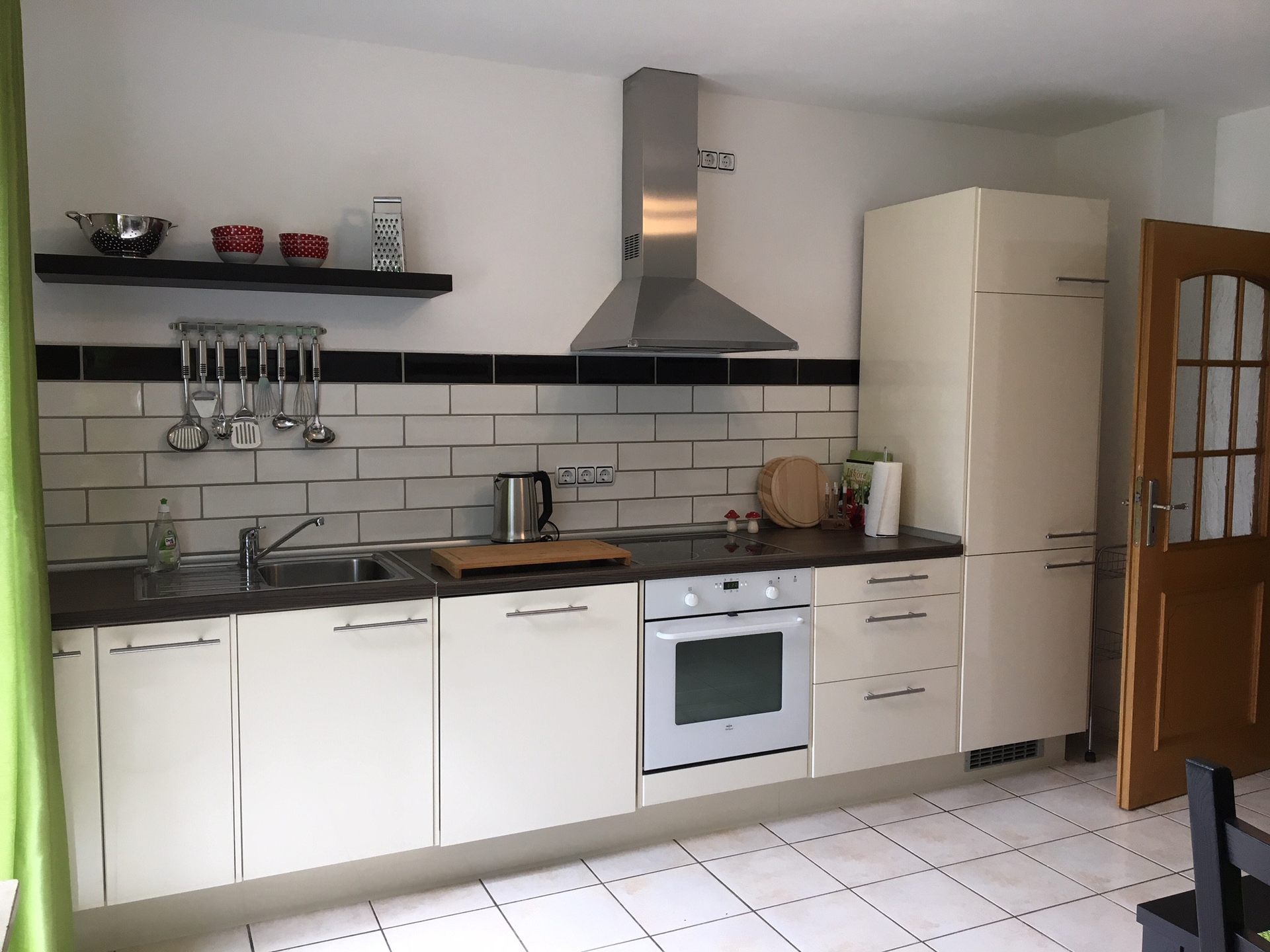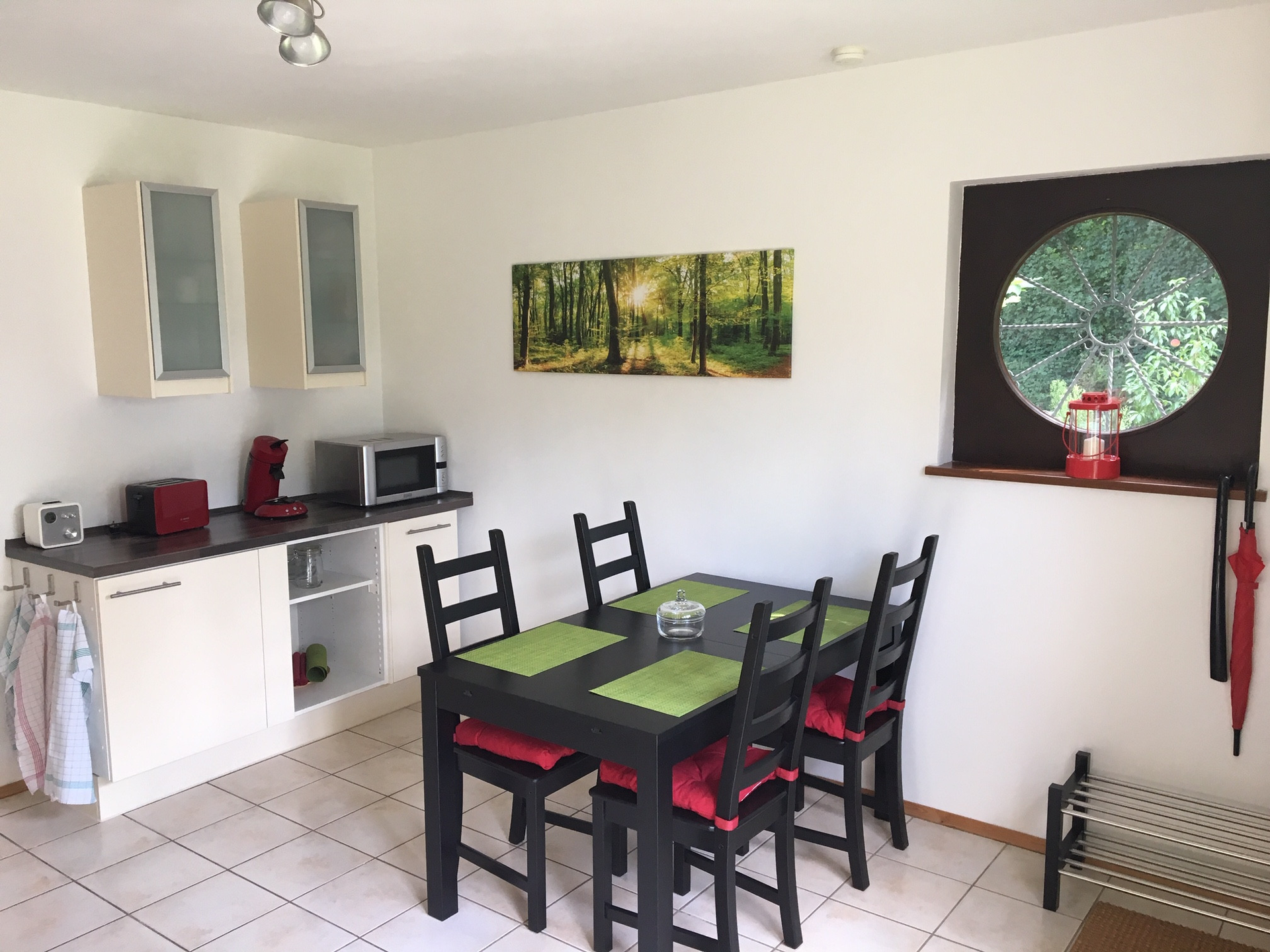 Moderne Ferienwohnung in Waldrandlage. Lichtdurflutete Räume, eigene Terrasse, voll ausgestattete Küche, renoviertes Bad mit Dusche, Stellplatz, kostenloses WLAN, Hühner am Haus