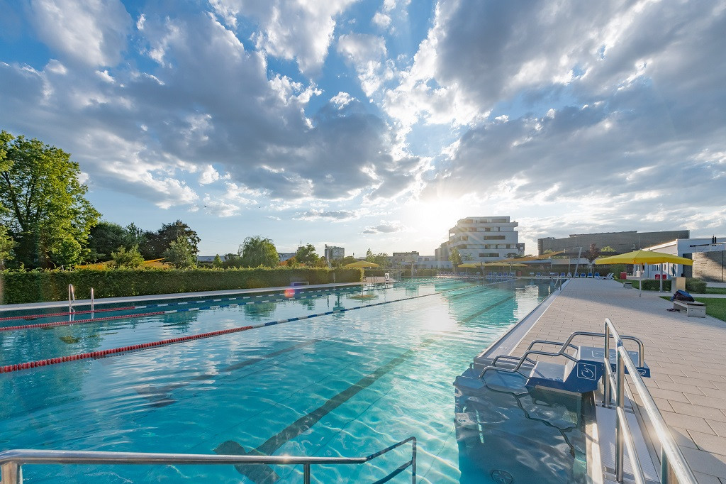 - Sonnenliegen rund um die Becken sowie Pfandliegen zur Nutzung auf der Liegewiese