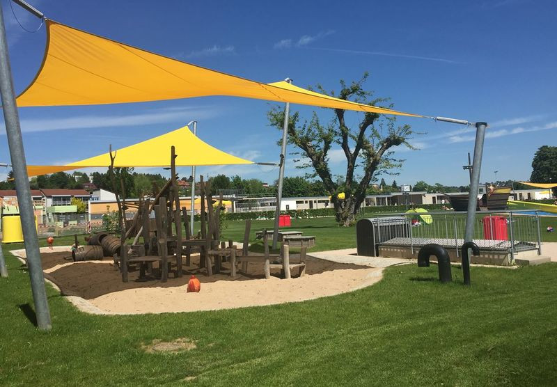 - großer Abenteuerspielplatz mit Sand- und Matschanlage und Sonnensegel