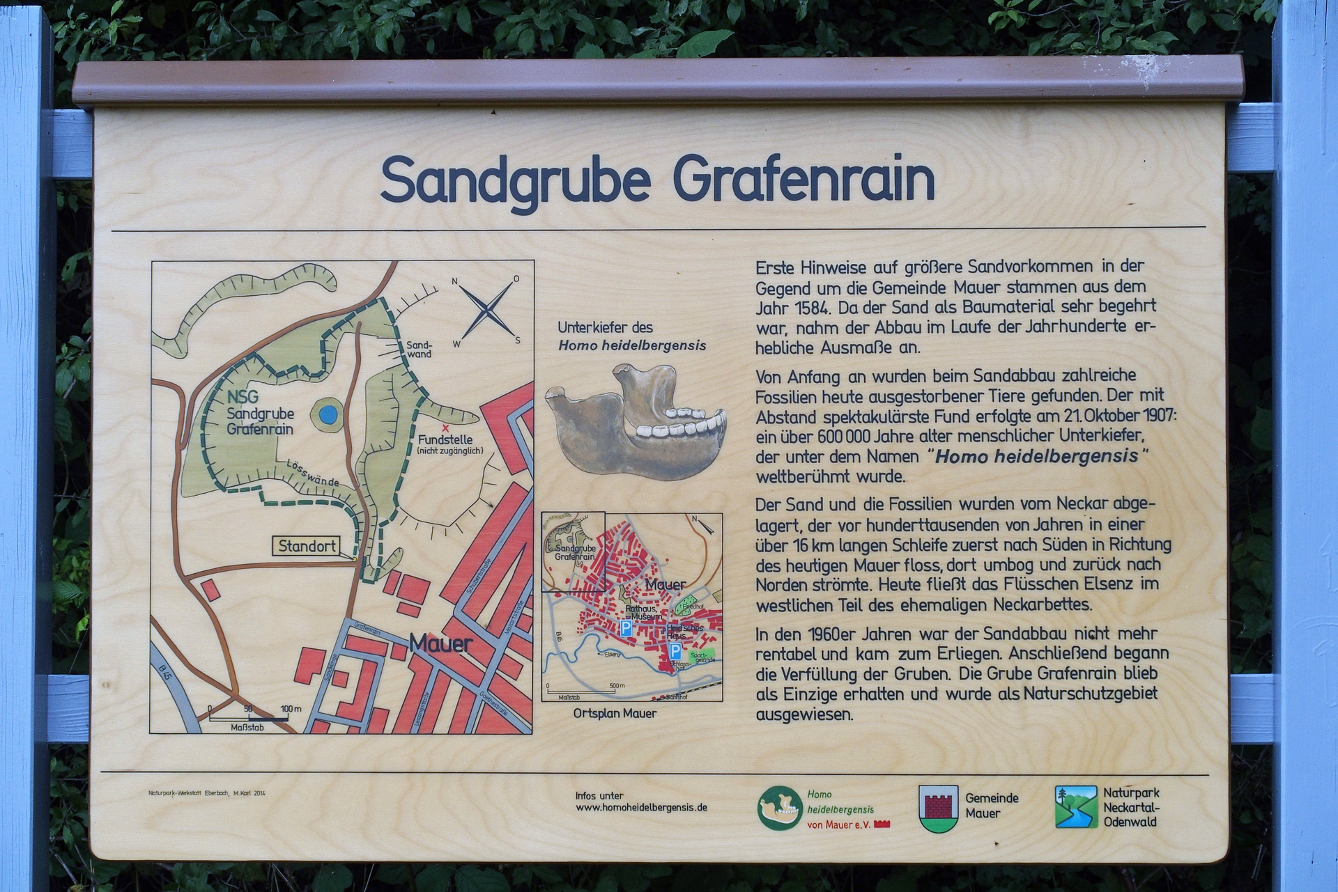Im heutigen Naturschutzgebiet Sandgrube am Grafenrain nördlich von der Gemeinde Mauer wurde 1907 der rund 600.000 Jahre alte Unterkiefer eines "Homo heidelbergensis" von dem Sandarbeiter Daniel Hartmann entdeckt. Das Original befindet sich heute im Geologisch-Paläontologischen Institut der Universität Heidelberg. Im Urgeschichtlichen Museum im Rathaus von Mauer ist eine Abbildung des Unterkiefers zu besichtigen sowie mehr über die Geschichte der Urmenschen zu erfahren.