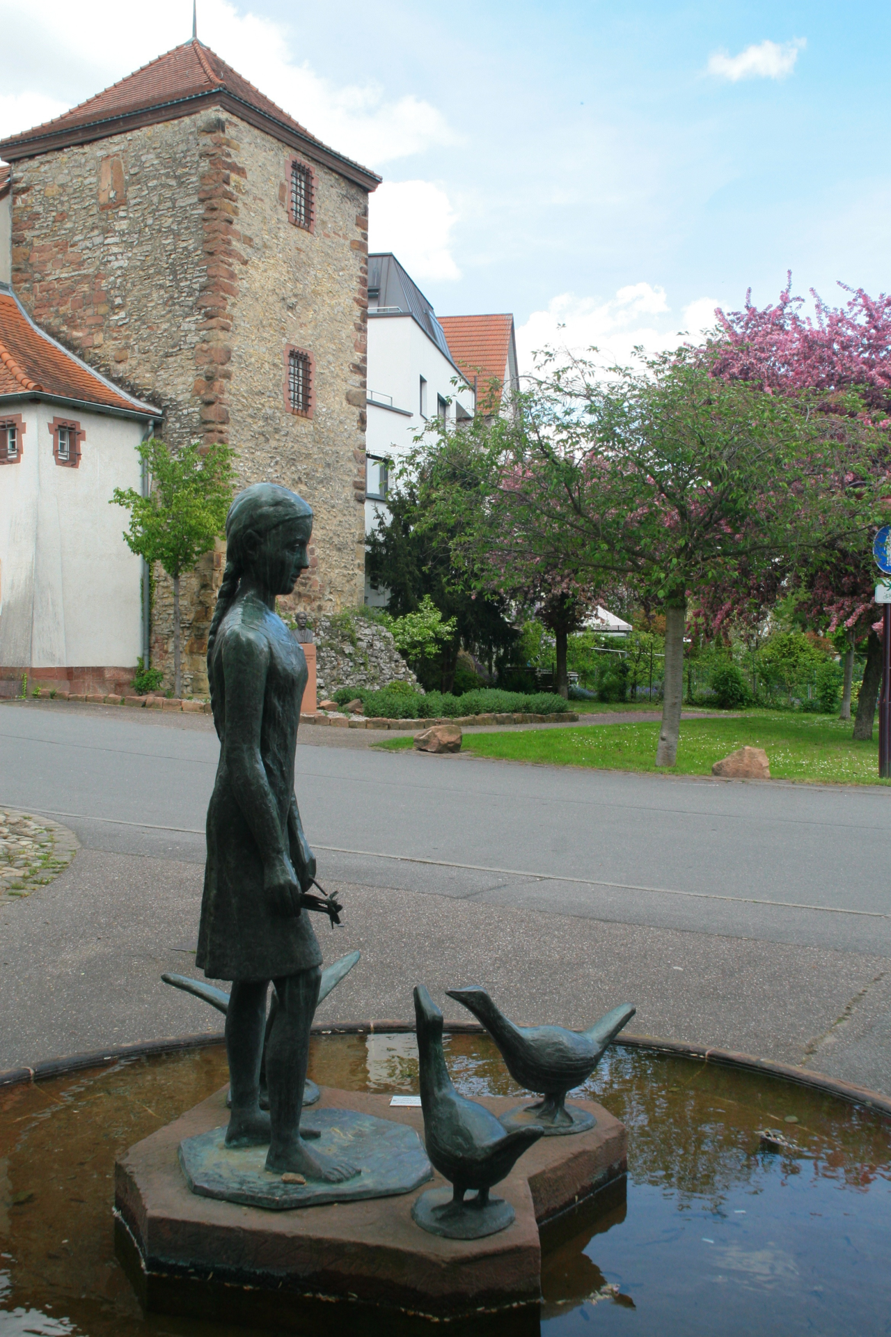 Auf der Tuchbleiche, jenseits des Leimbachs, hatten die Gänse der Wieslocher ihre "Weide". Die Gänseliesel holte die schnatternden Geflügeltiere morgens, beaufsichtigte sie tagsüber und lieferte sie abends wieder bei ihren Besitzern ab. Zur Erinnerung an diesen Brauch schuf der Bildhauer Helmut Waldherr eine Plastik vor der historisierenden Stadtmauer.