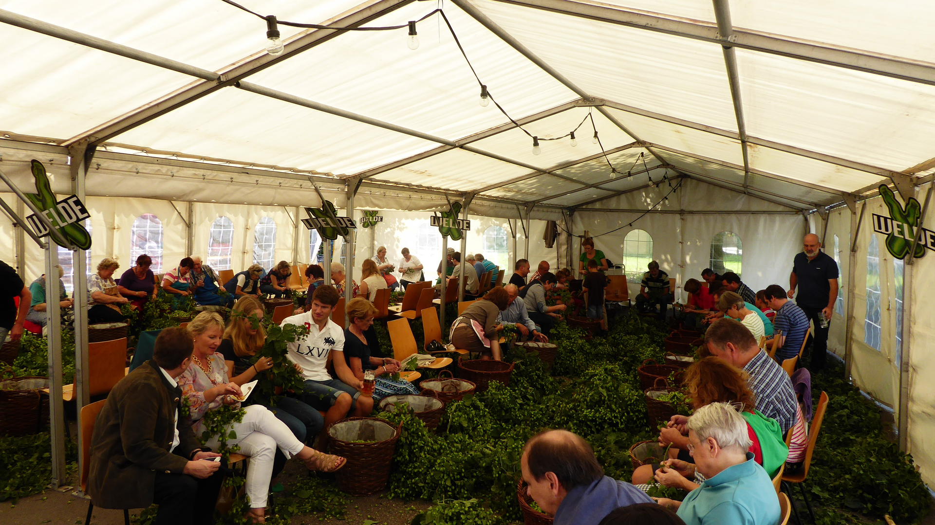 Und einmal im Jahr wird geerntet. Da heißt es "Hopfenernte zum Mitmachen". Anfang September (der genaue Termin ist abhängig vom Reifezustand des Hopfens) lädt die Gemeinde Sandhausen, der MGV 1869 Germania und die Braumanufaktur Welde zum "Hopfezopfe" ein. Gäste, Freunde und Gemeindemitglieder zopfen gemeinsam wie "anno dazumal" an einem Wochenende auf dem Festplatz hinter dem Rathaus den Hopfen. So ganz nebenbei lässt man sich ein Bierchen (oder auch zwei) schmecken und erfährt das neueste vom Ortsgeschehen. Die Welde-Brauerei aus Plankstadt braut daraus eine "special edition", die pünktlich zur Sandhäuser Kerwe in den Verkauf kommt.