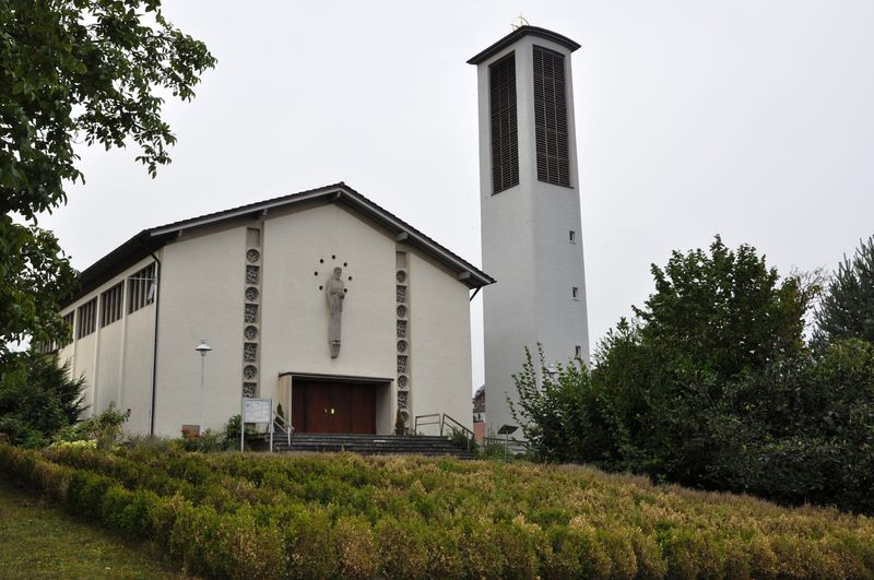 Die Joseph-der-Arbeiter-Kirche wurde 1957 nach Plänen des Architekten Anton Elsässer aus Karlsruhe-Durlach erbaut.