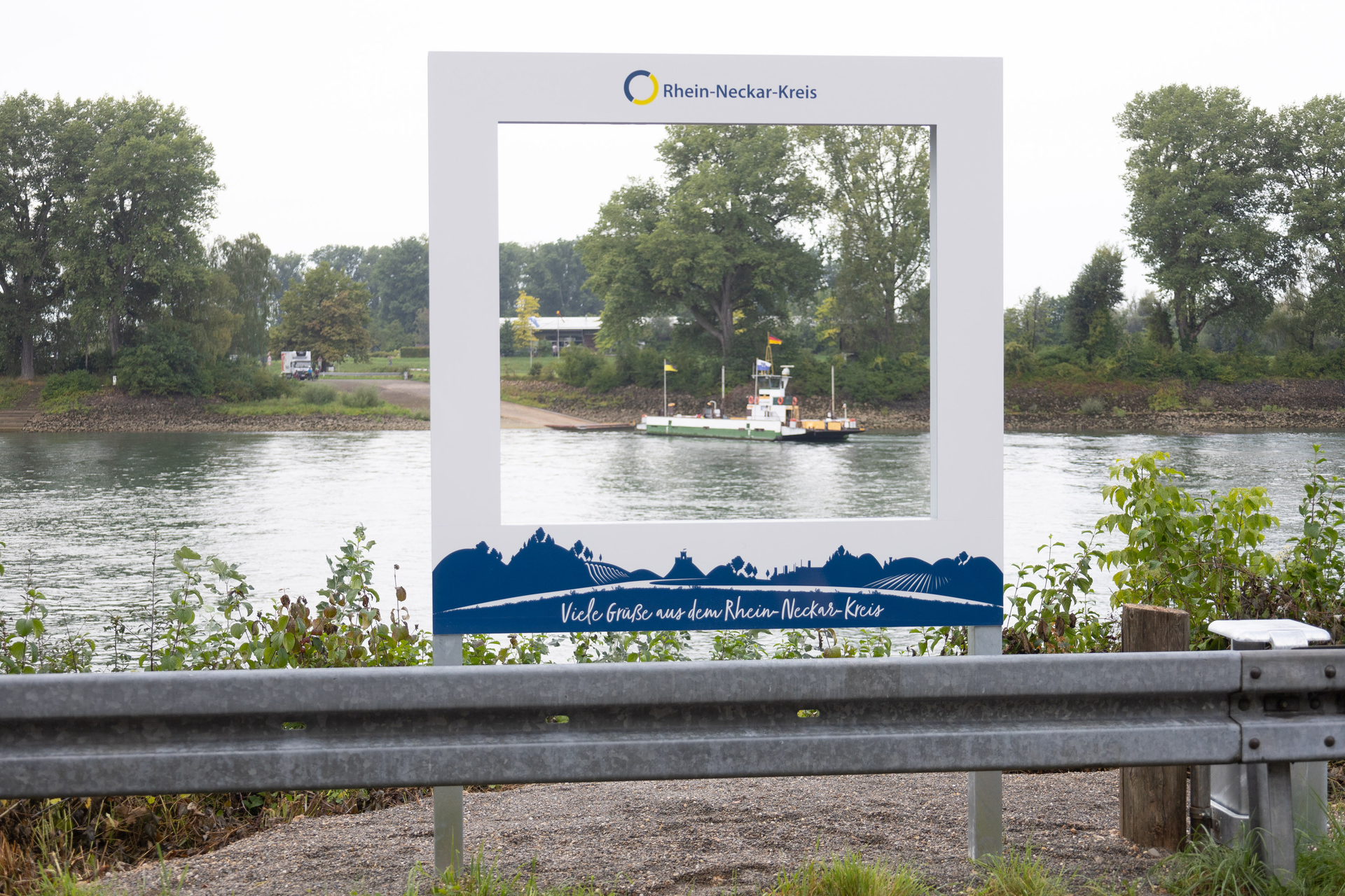 Einen ganz besonderen Landschaftsausschnitt zeigt der Fotorahmen am Rheinufer in Brühl bei der Kollerfähre. Der Landschaftsrahmen gewährt einen einzigartigen Blick auf den Rhein, die Fähre und die Kollerinsel.