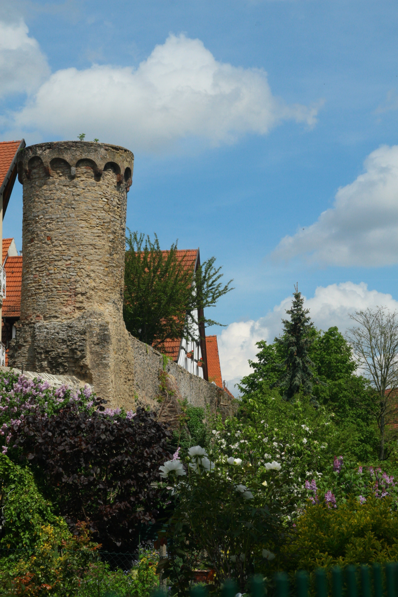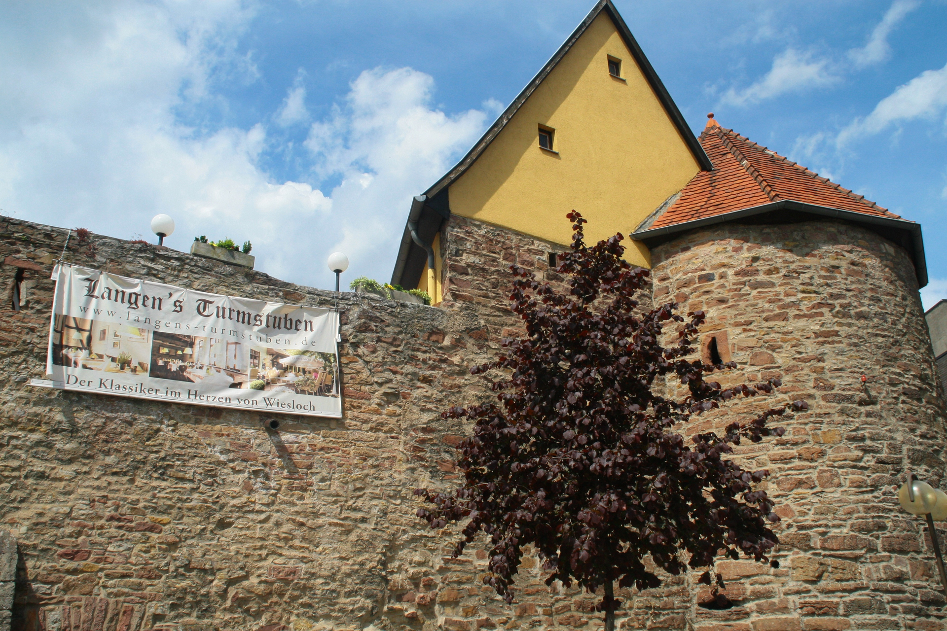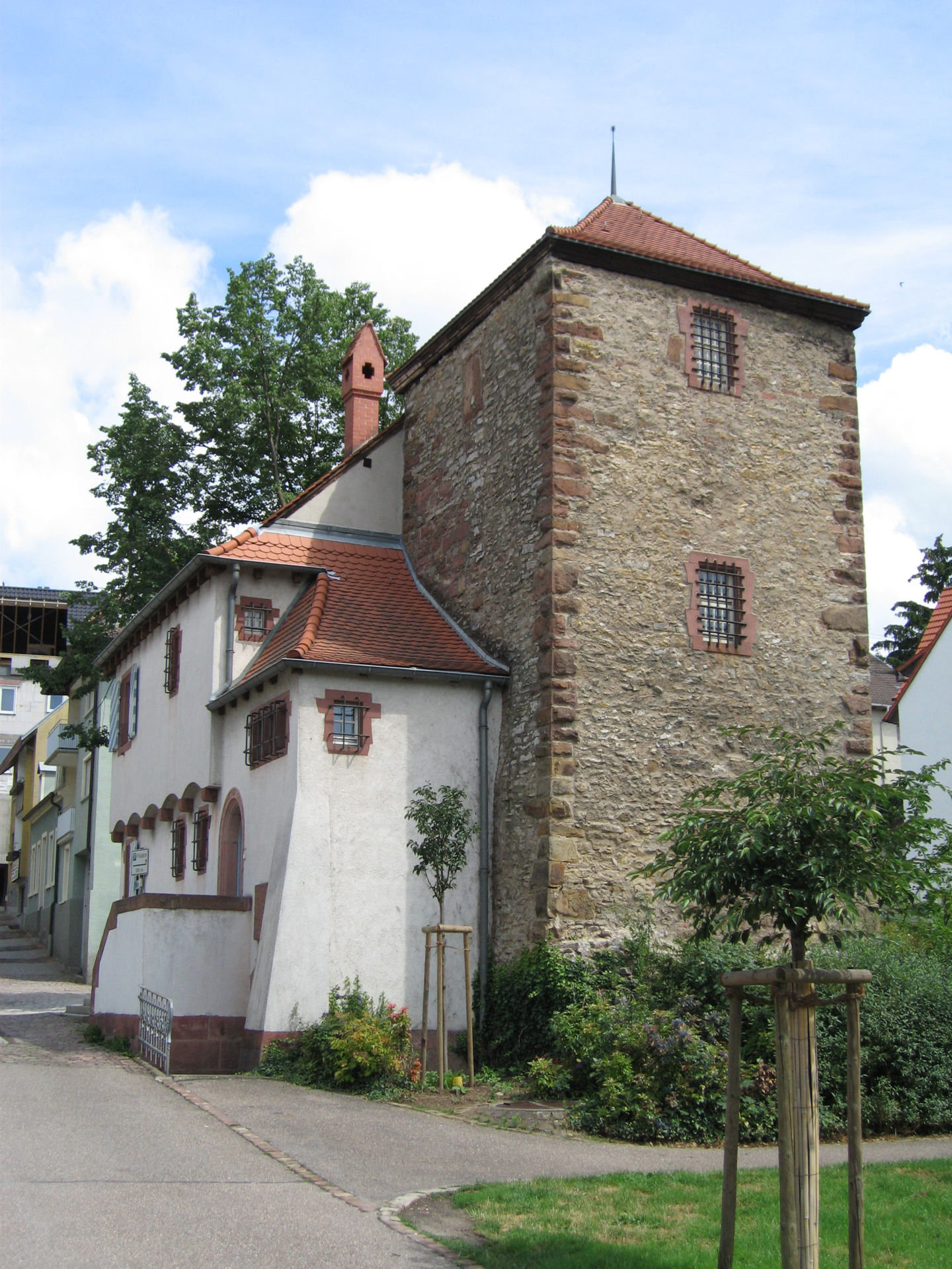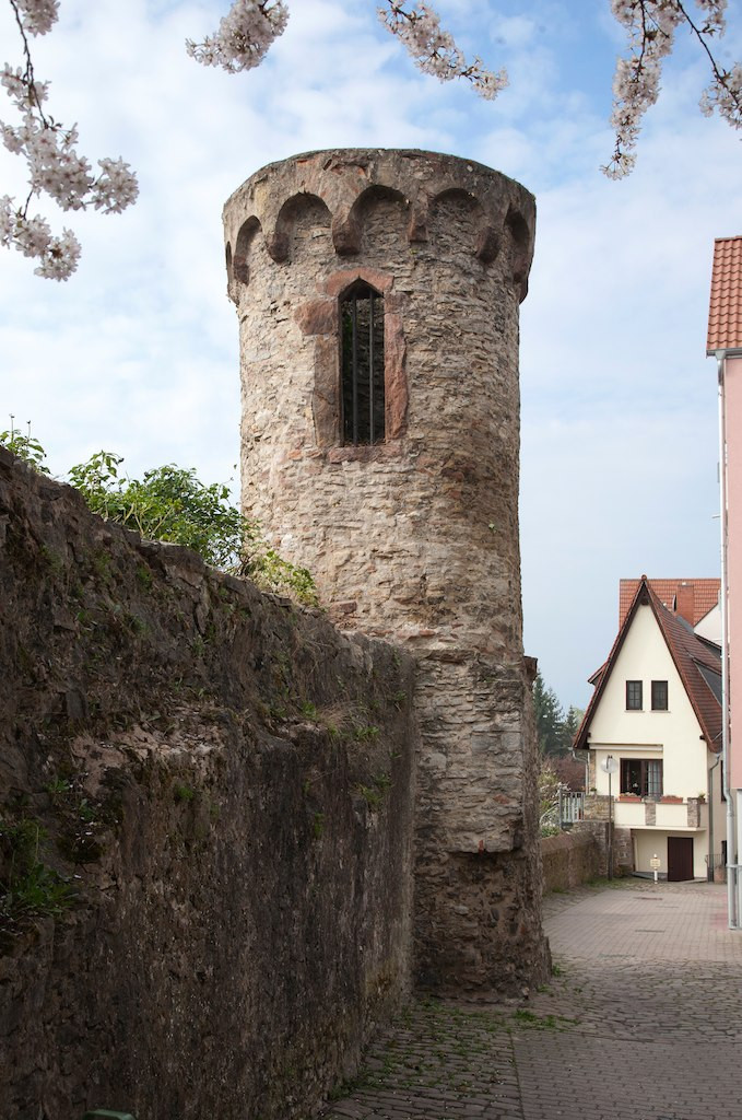 Der massige, etwa 8m hohe "Runde Turm" besteht aus Buntsandstein und hat feindseitig verschiedene Schießscharten. Heute ist dort das Lokal "Langens Turmstuben" hineingebaut.