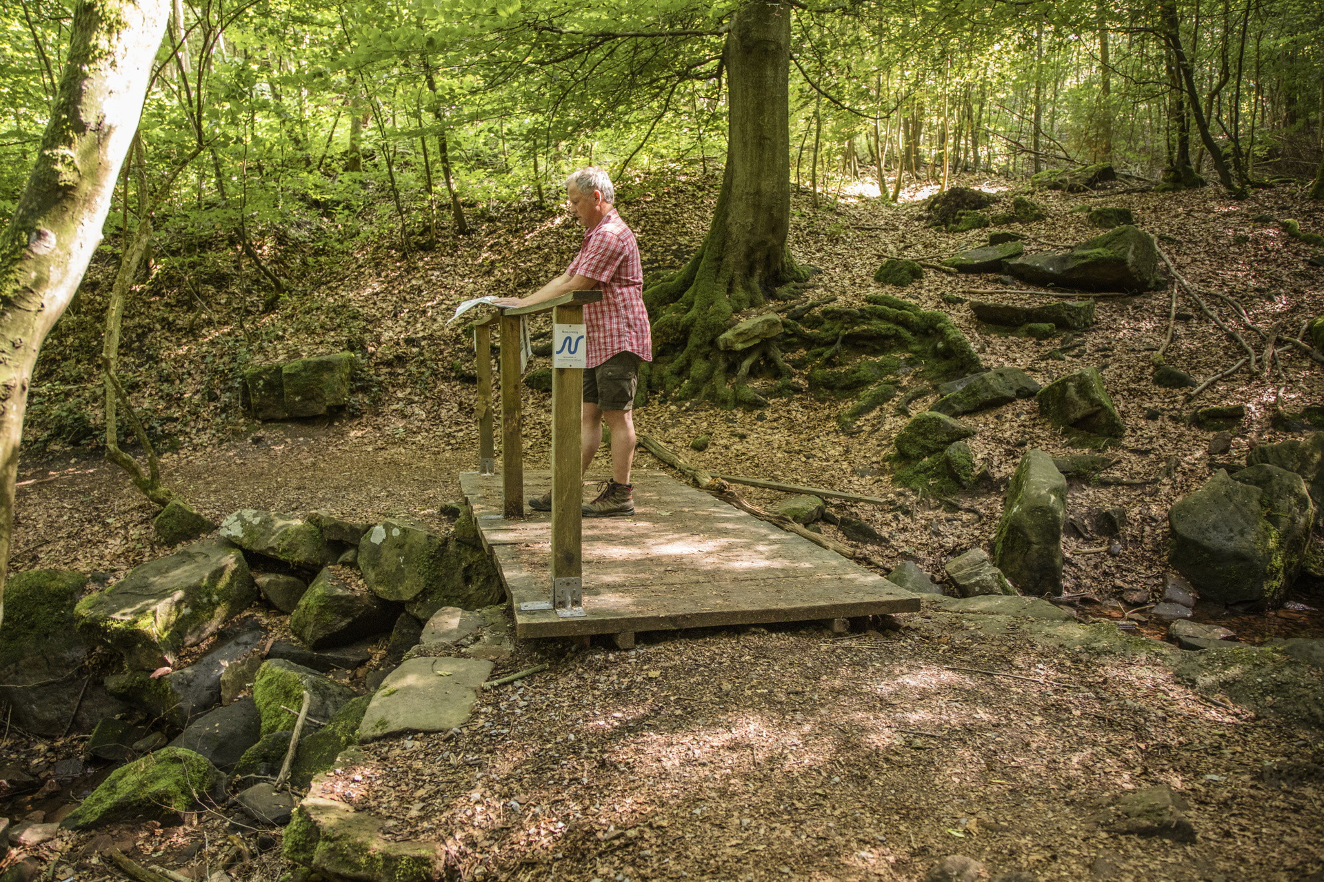 Der Verbindungsweg vom Dilsberg nach Neckarsteinach ist ein wunderschöner Pfad durch Laubmischwaldgebiet.
