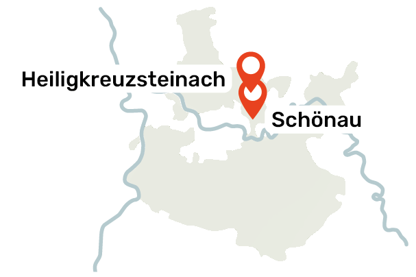 In südlicher Richtung führt der Weg nach Altneudorf und weiter nach Schönau – rund sechs Kilometer leicht bergab, immer am Wasser entlang. Der gut ausgebaute Rad und Wanderweg schlängelt sich durch das Steinachtal, mitten durch die bewaldeten Hänge des Odenwalds, wo jede Jahreszeit mit unterschiedlichsten Farben und Stimmungen verzaubert. Die Steinach, unser Begleiter, mündet in Neckarsteinach in den Neckar.