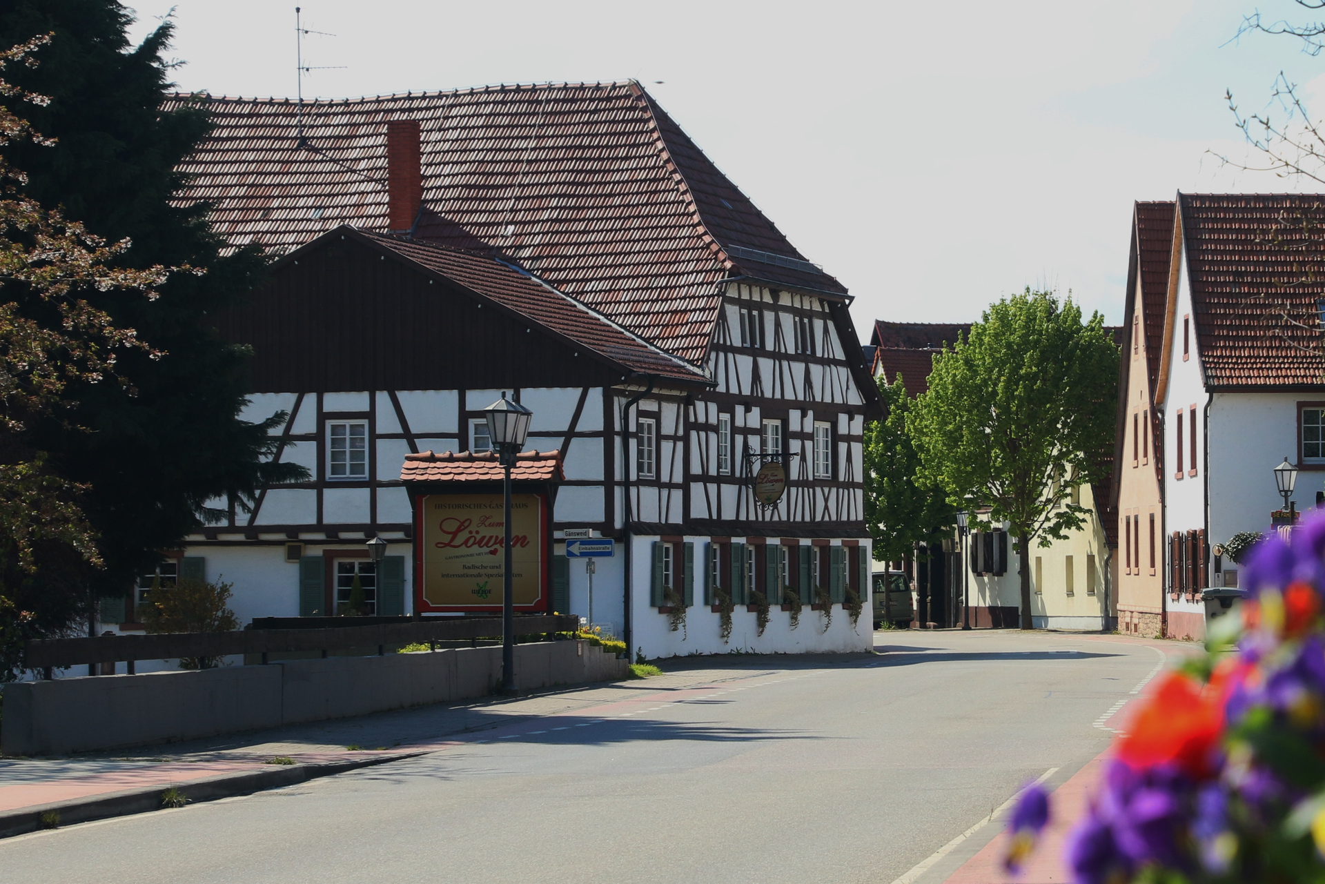 Fachwerkhaus mit rotem Ziegeldach und Schild 'Zum Löwen' an einer ruhigen Straße, rechts weitere Häuser und Bäume. | © Landratsamt Rhein-Neckar-Kreis