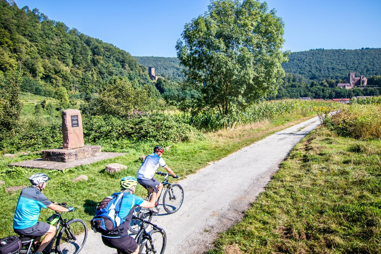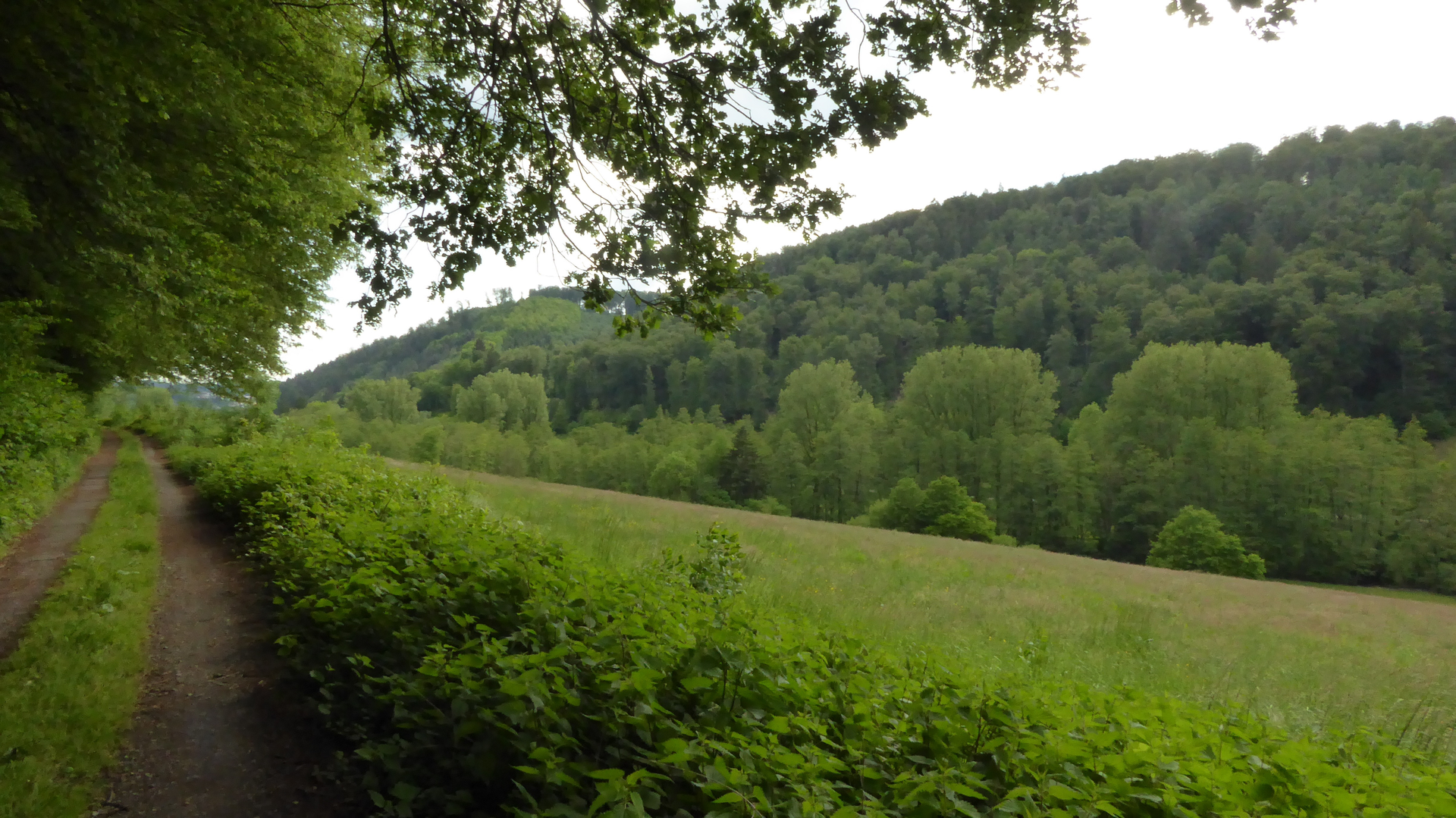 Unterhalb des Dilsbergs angelangt eröffnet sich uns ein schöner Blick aufs andere Neckarufer und die bedeutendsten Sehenswürdigkeiten der Gemeinde Neckarsteinach, die vier Burgen: Burg Schadeck ("Schwalbennest"), Hinterburg, Mittelburg und Vorderburg. Vor dem Campingplatz „Unter’m Dilsberg“ geht es rechts auf einen Schotterweg. Dies ist unsere erste Steigung mit ca. 200 Höhenmeter. Direkt auf der Kuppe folgen wir dem asphaltiertem Weg nach rechts. Dieser Weg ist leicht ansteigend. An der Neckargemünder Straße biegen wir links ab.