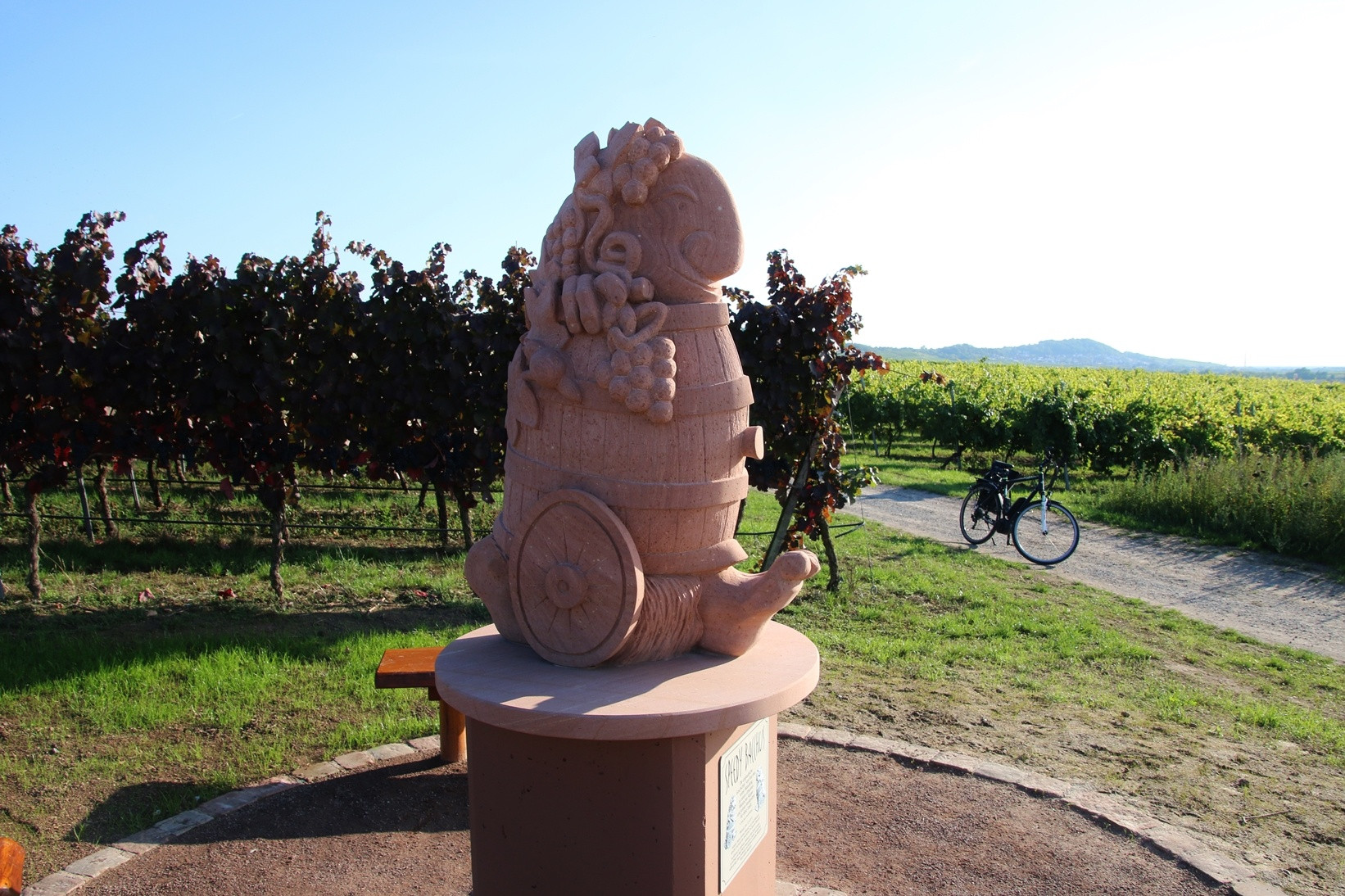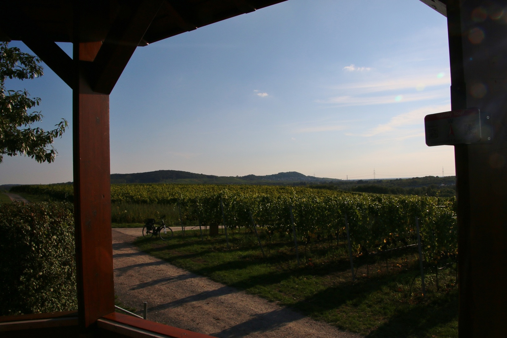 In der Stadtmitte führt die Route nun westlich über Wohnstraßen auf dem gerade verlaufenden Weg durch Weinberge zu den Aussiedlerhöfen. Auf den höchsten Punkt sehen wir beim klaren Wetter über die Rheinebene hinweg bis zu den Pfälzer Berge. 500 m links der Strecke ist die Besenwirtschaft Ihle ein idealer Platz den lokalen Wein zu versuchen. Der Radweg führt unter der A6 an der Ortschaft Frauenweiler vorbei und über einen Feldweg gelangen wir wieder zurück an unseren Startpunkt, zum Bahnhof Wiesloch-Walldorf.