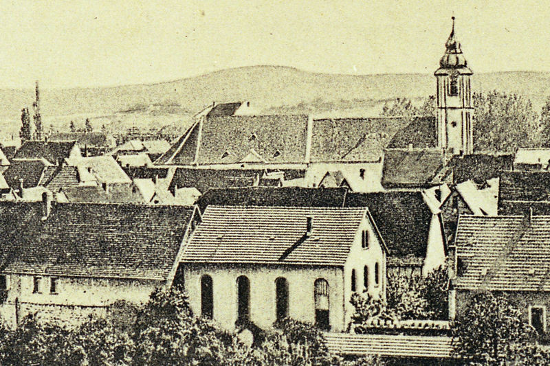 Historischer Blick auf die ehem. jüdische Synagoge Sinsheim mit Kirche im Hintergrund | © Unbekannt