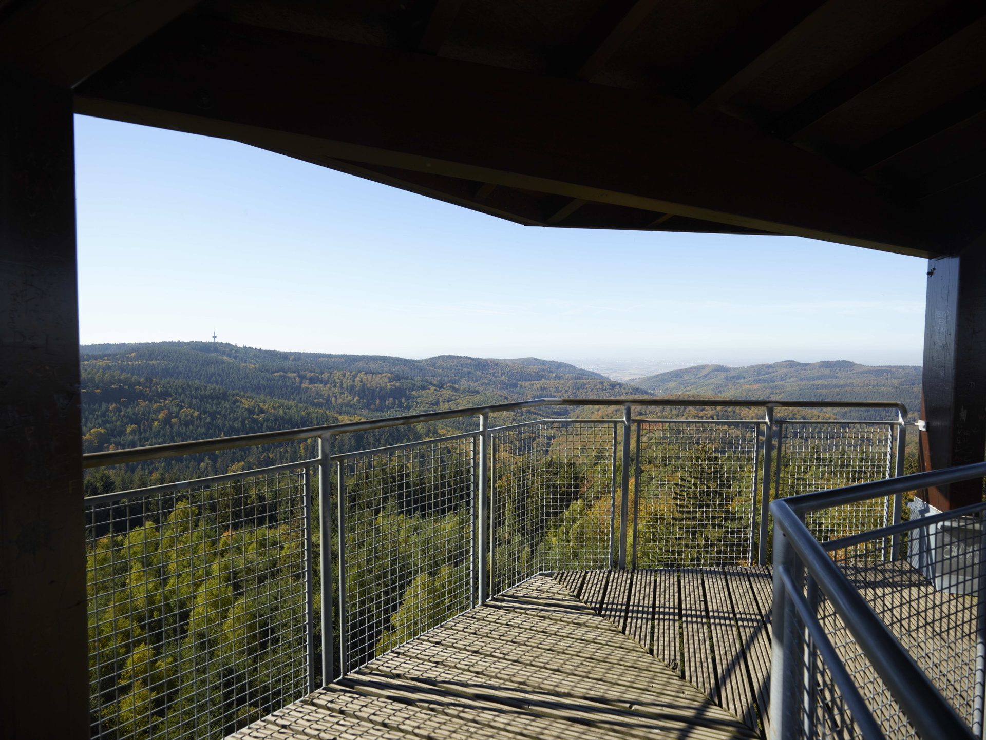 Der Turm selbst ist eine gefällige, moderne und schlanke Lärchenholzkonstruktion und bietet einen ästhetischen Blick. Die Aussichtsplattform ist rund 36 Meter hoch und liegt auf dem rund 530 Meter hohen Schriesheimer Kopf. Bei klarer Sicht ist ein Weitblick über die Rheinebene bis zum Pfälzer Wald möglich.
