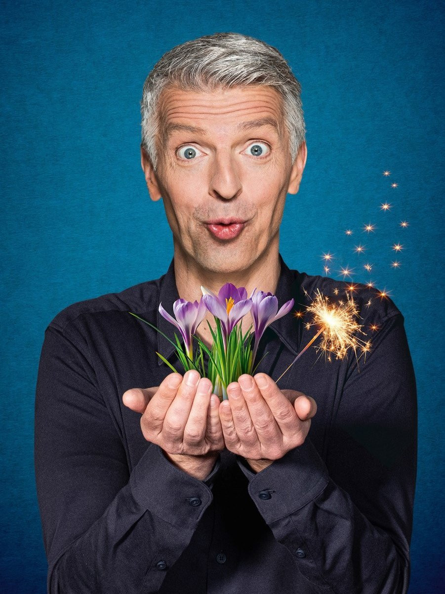 Künstler hält einen Strauß Krokusse sowie eine Wunderkerze in der Hand