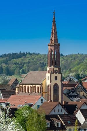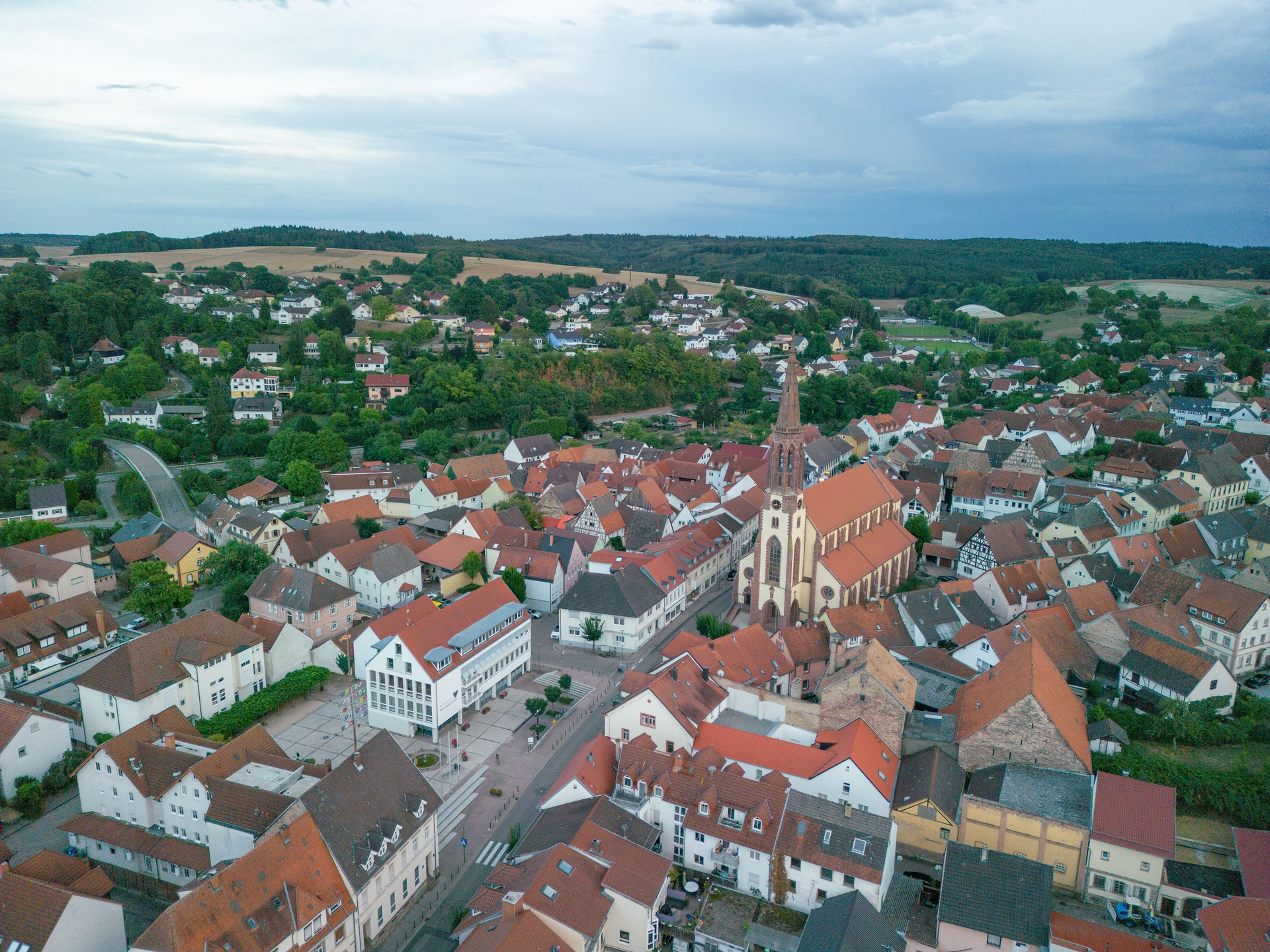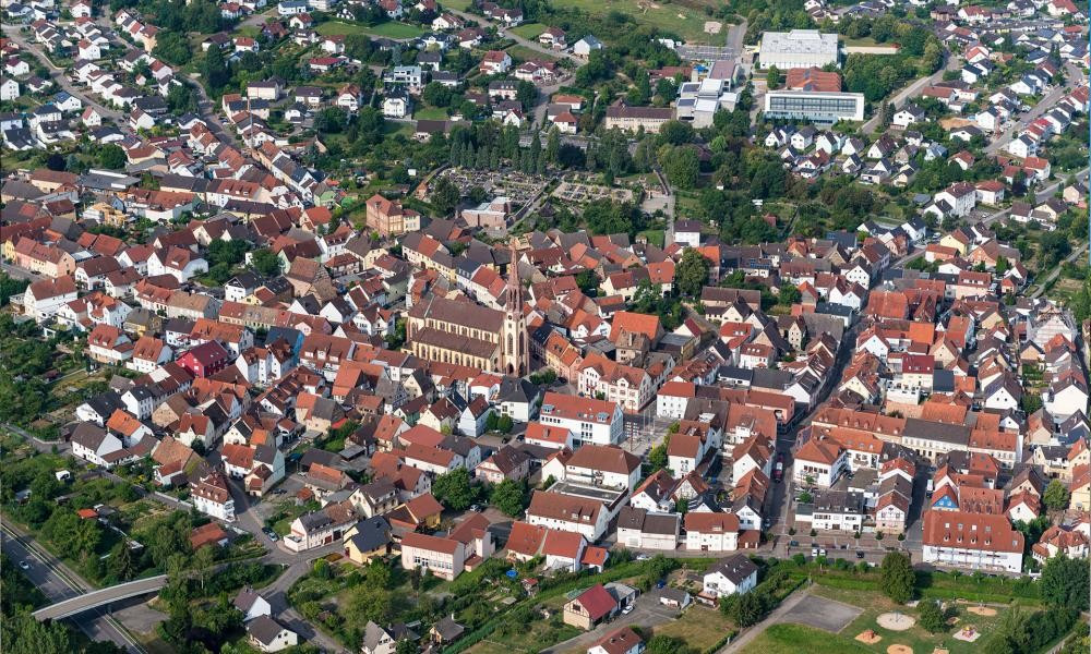 Blick auf die Stadtpfarrkirche und Dächer von Waibstadt vor blauem Himmel | © Stadt Waibstadt