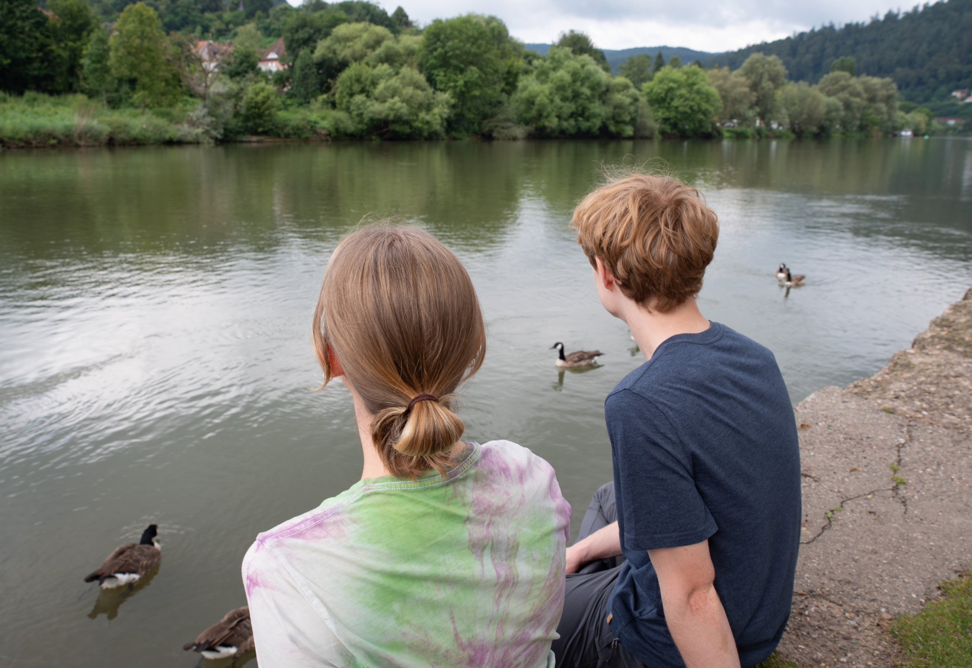 Ein Fluss  mit 3 Enten. An der Ufermauer sieht man eine Frau und ein Mann sitzen und auf den Fluss schauen