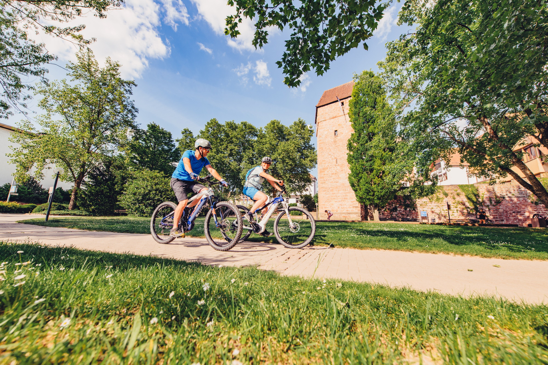 Zwei Radfahrer auf einem Radweg. Im Hintergrund ist eine Stadtmauer mit einem Turm. Eberbach im Odenwald. | © Tourstikgemeinschaft Odenwald e.V.