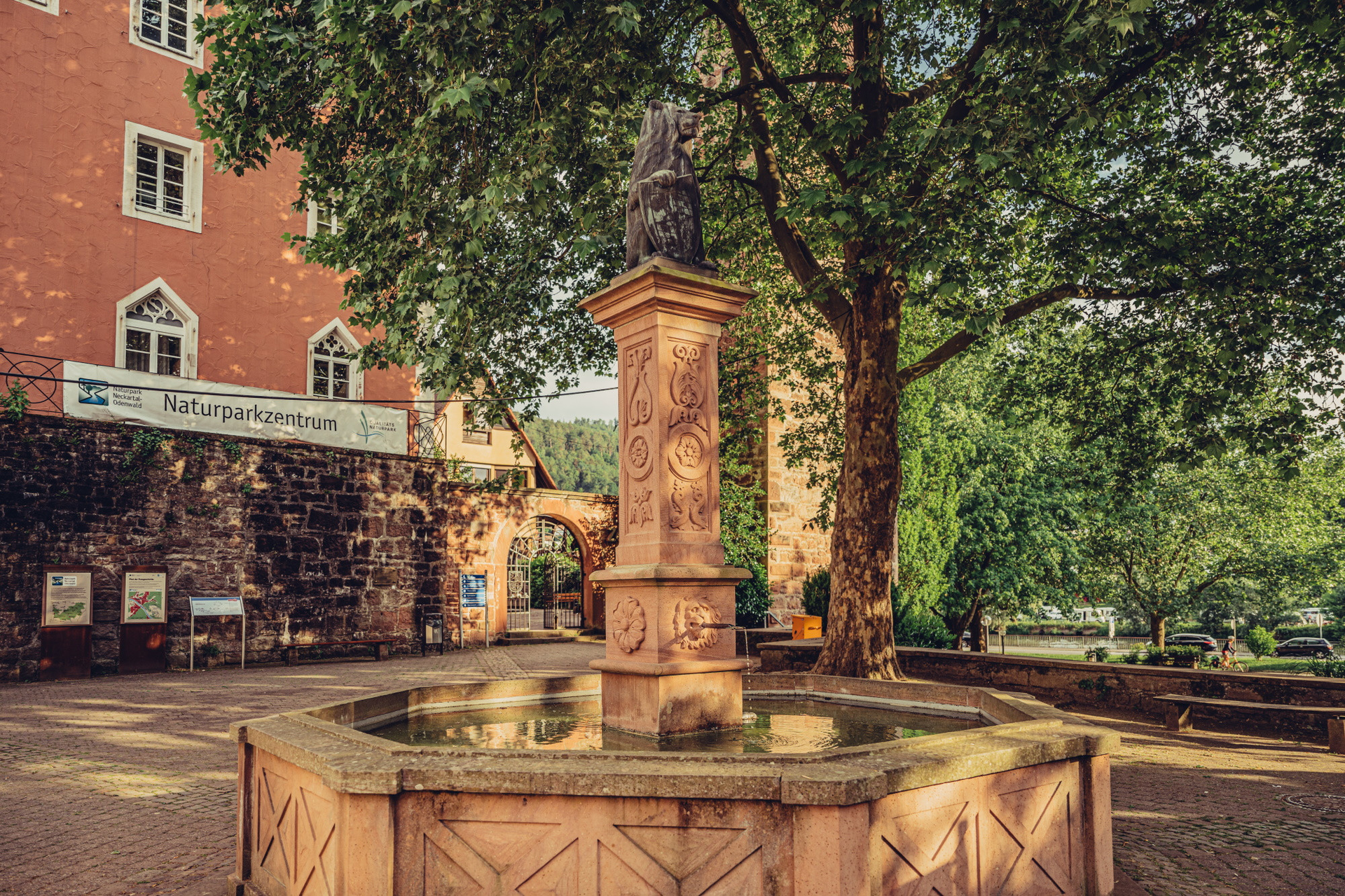Brunnen aus Buntsandstein. Im Hintergrund ein rotes Haus mit einem Baum. Eberbach im Odenwald | © Touristikgemeinschaft Odenwald e.V.